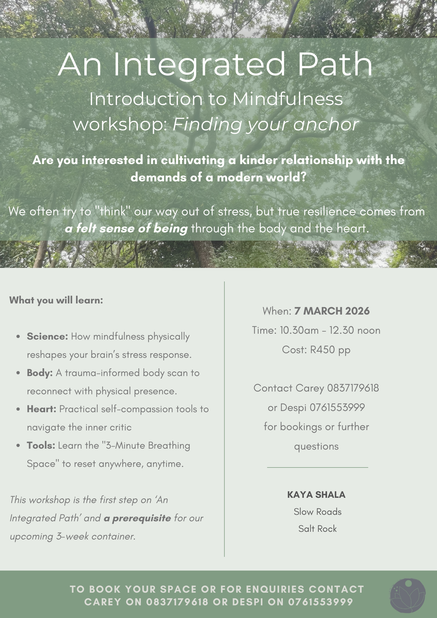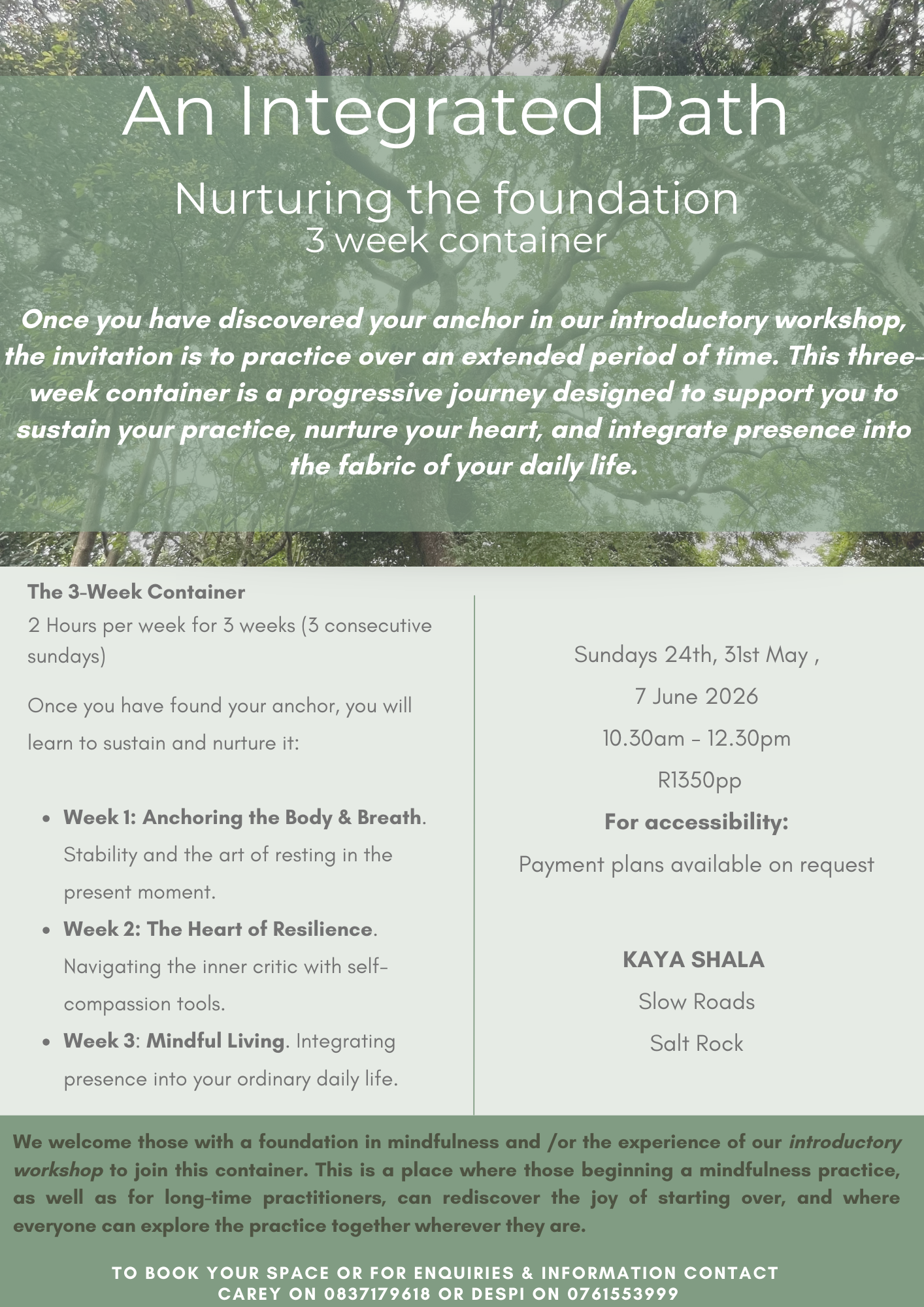 Preparing the ground. The introduction or refresher, provides the foundational step anchors that you can either practice in your daily life or take with you to deepen your practice into the 3 day container spanning over three consecutive weeks (sunday mornings).